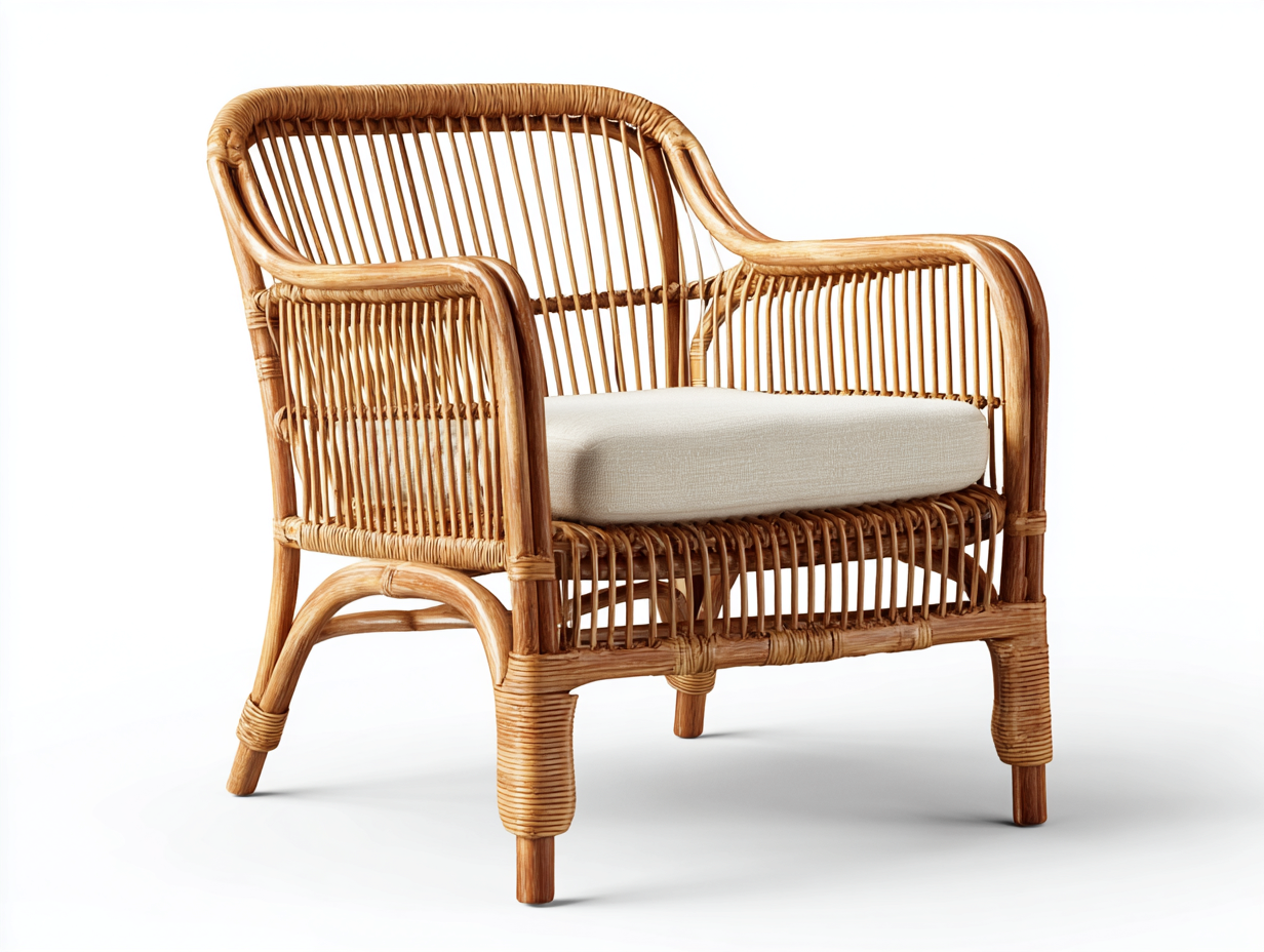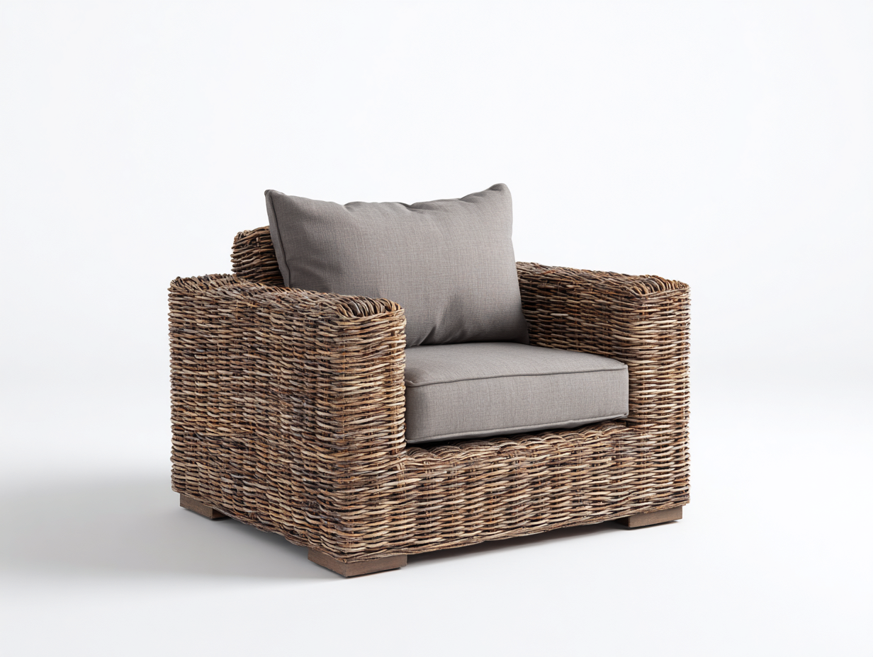 El sillón está fabricado en ratán natural trenzado que resalta la textura orgánica del material. El asiento incorpora un cojín en tono claro que mejora la comodidad y aporta un contraste armonioso con la estructura en color marrón claro.